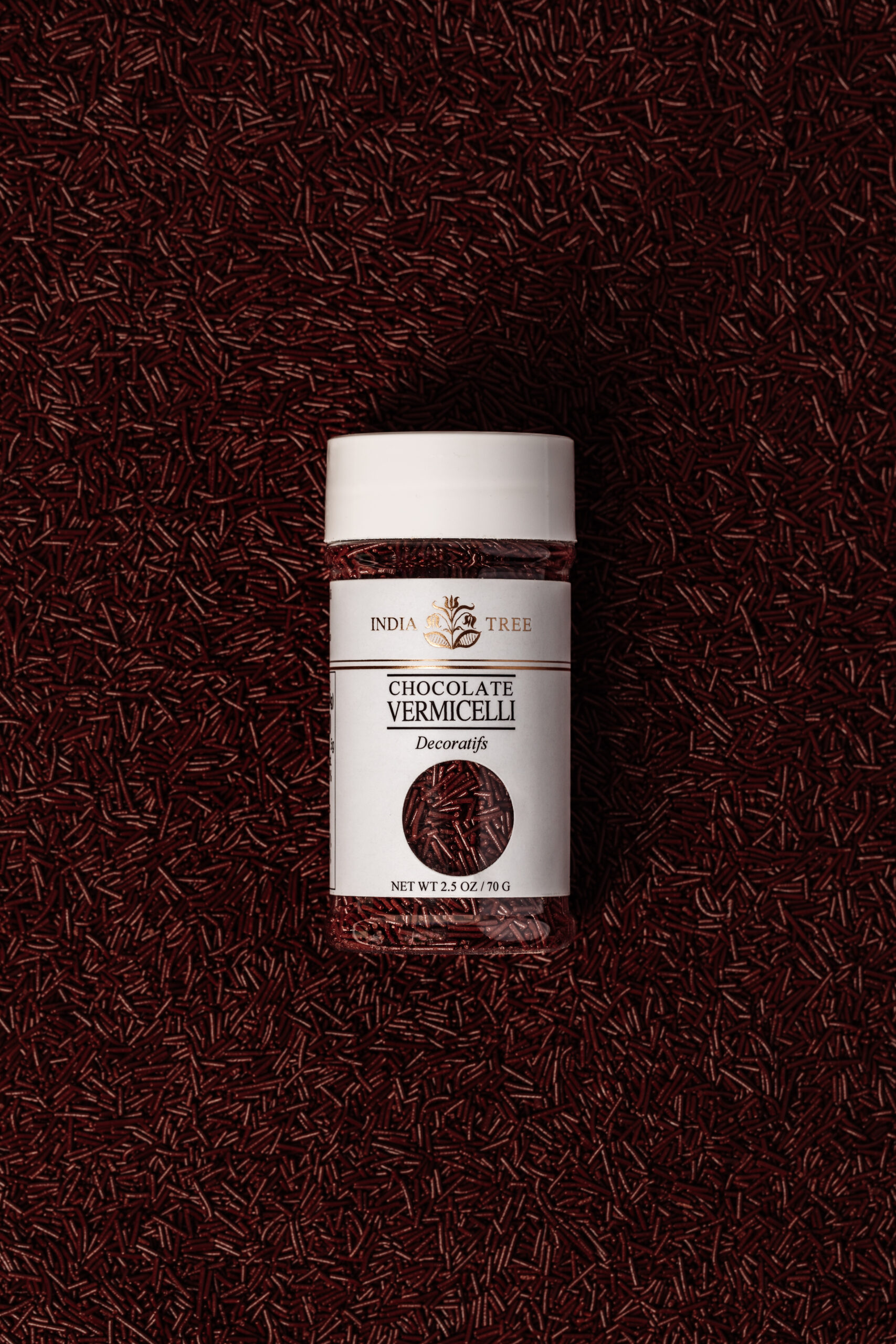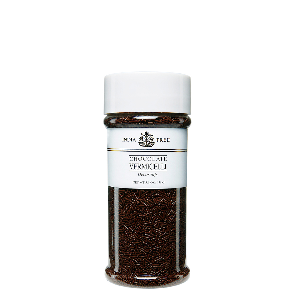 Chocolate vermicelli by India Tree. Chocolate vermicelli sprinkles and chocolate sprinkles for cakes, cupcakes, cookies, donuts, and ice cream.