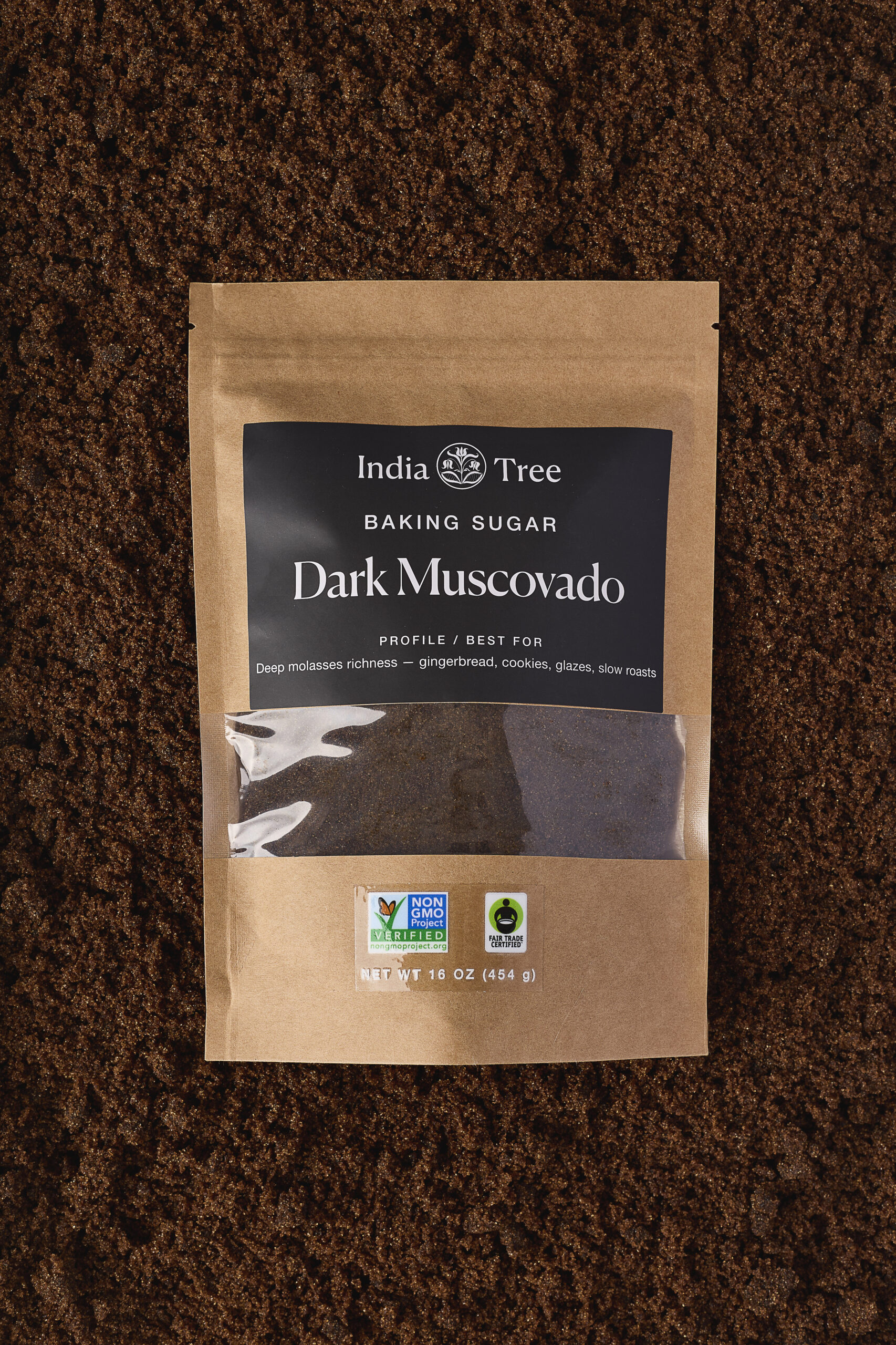 Dark muscovado sugar with syrup-dark richness, burnt caramel intensity, and molasses depth for black coffee caramel, roasted fig compote, and brown-butter brownies – part of the Premium Baking Sugars and India Tree Baking Sugars collections from India Tree.