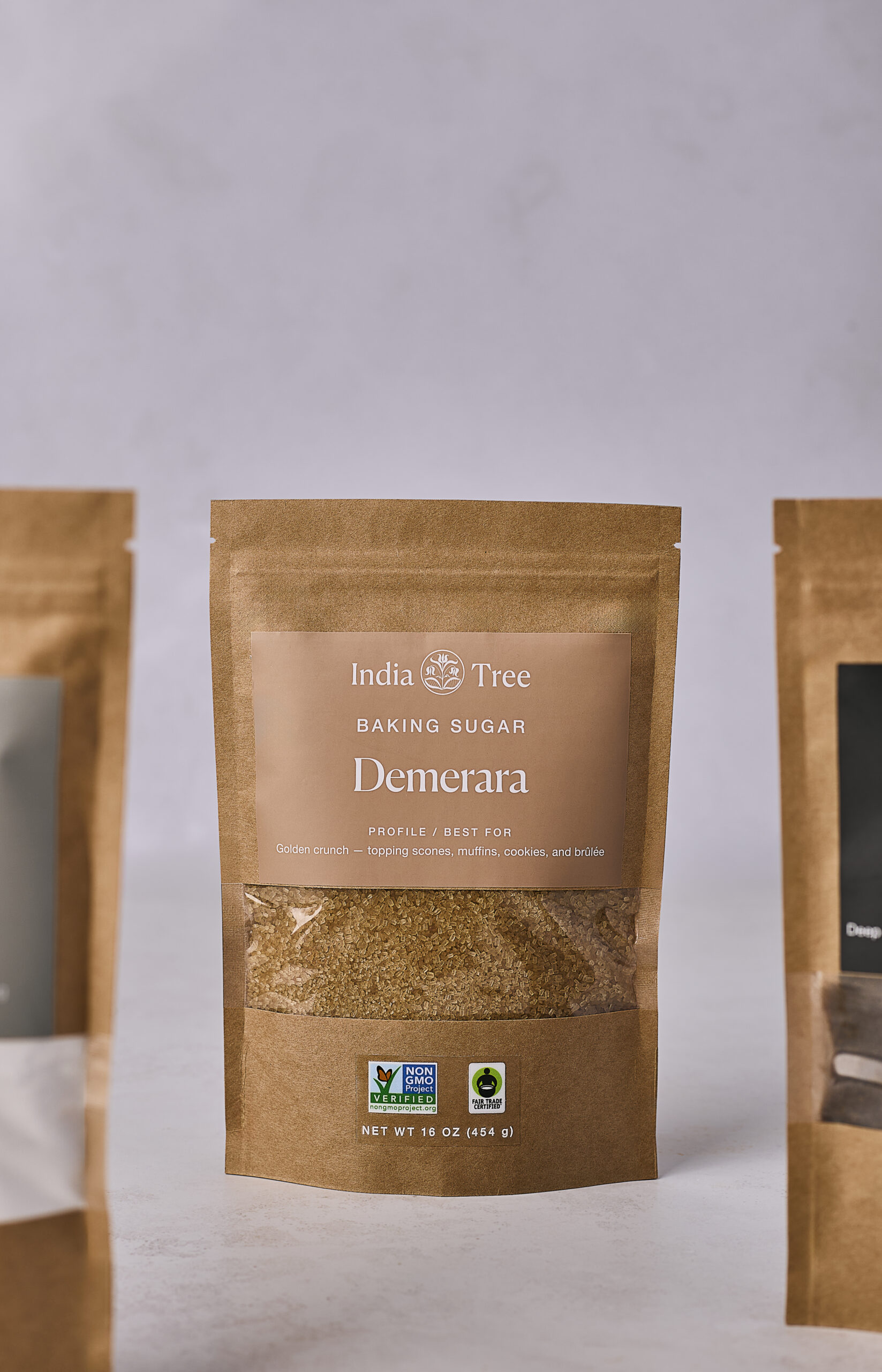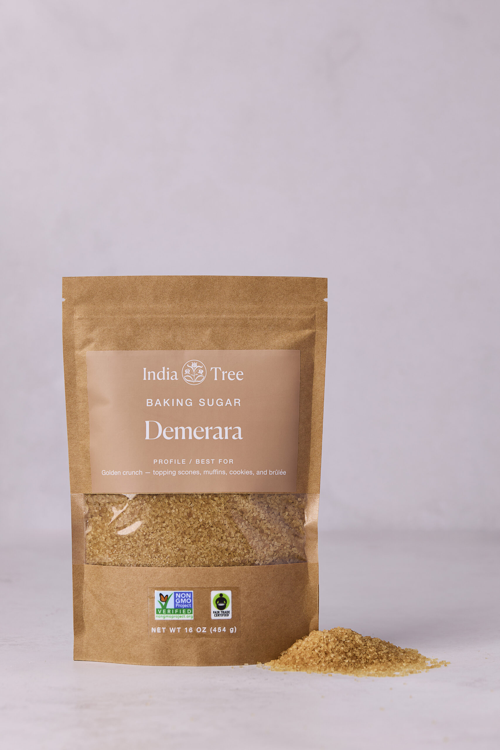 Demerara sugar with large golden crystals and soft caramel sweetness for brûlée, topping baked goods, and finishing drinks – part of the Premium Baking Sugars and India Tree Baking Sugars collections from India Tree.