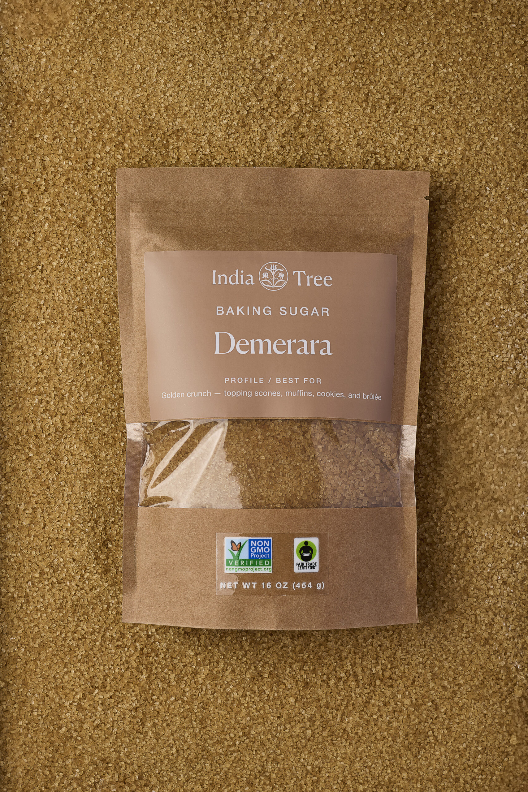 Demerara sugar with large golden crystals and soft caramel sweetness for brûlée, topping baked goods, and finishing drinks – part of the Premium Baking Sugars and India Tree Baking Sugars collections from India Tree.