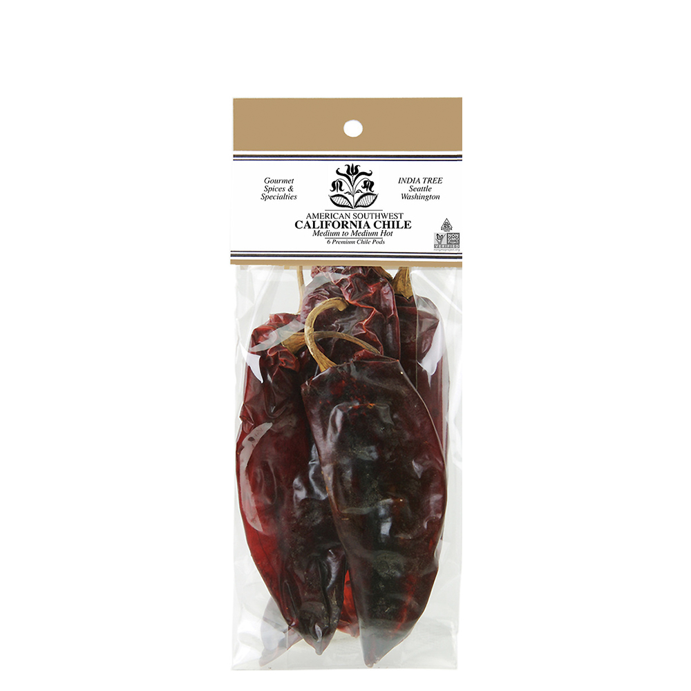 Dried California chiles and mild red chile pods for silken enchilada sauces, slow-simmered birria, and heritage bean stews. Premium dried Anaheim peppers from India Tree.