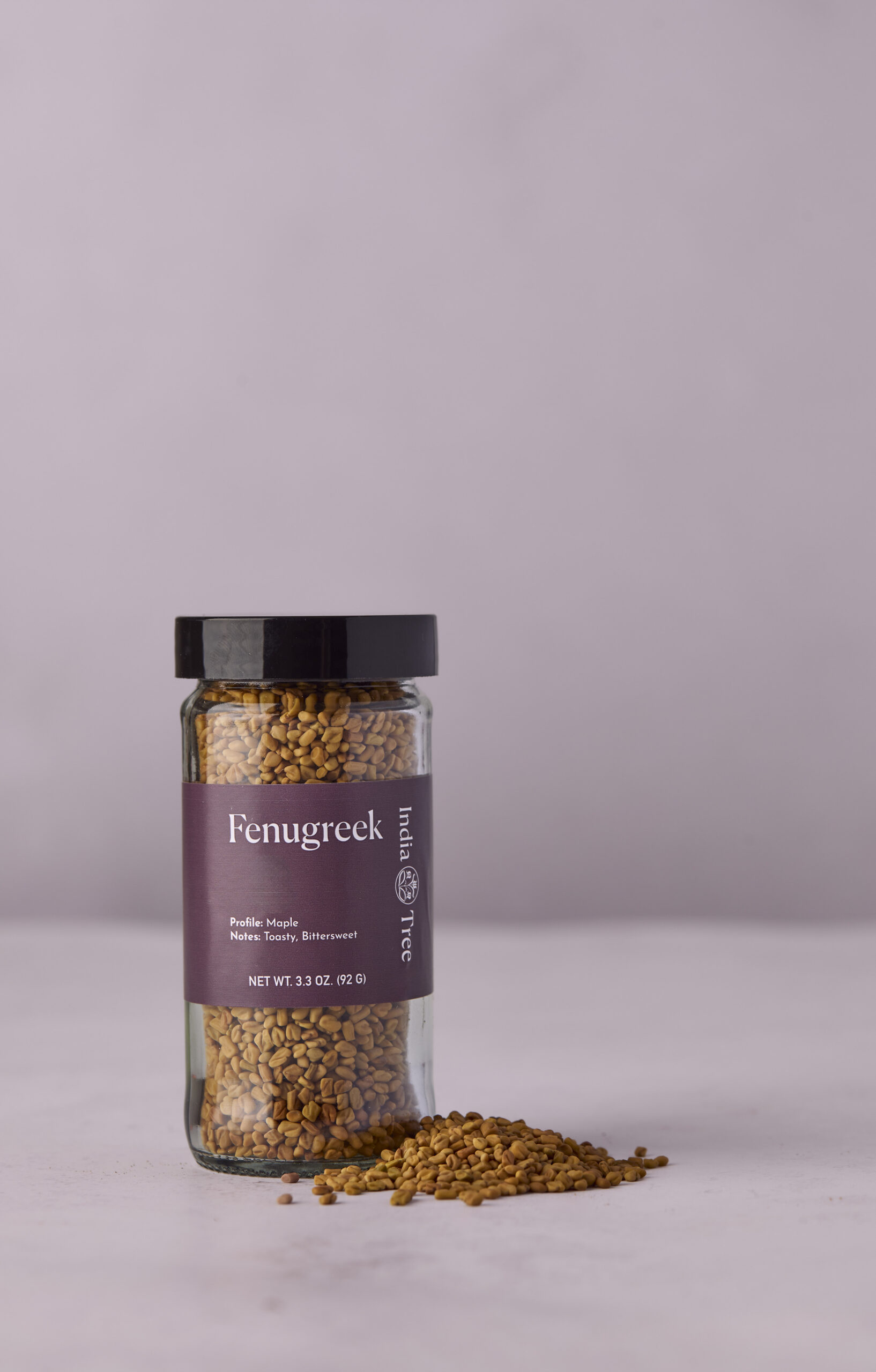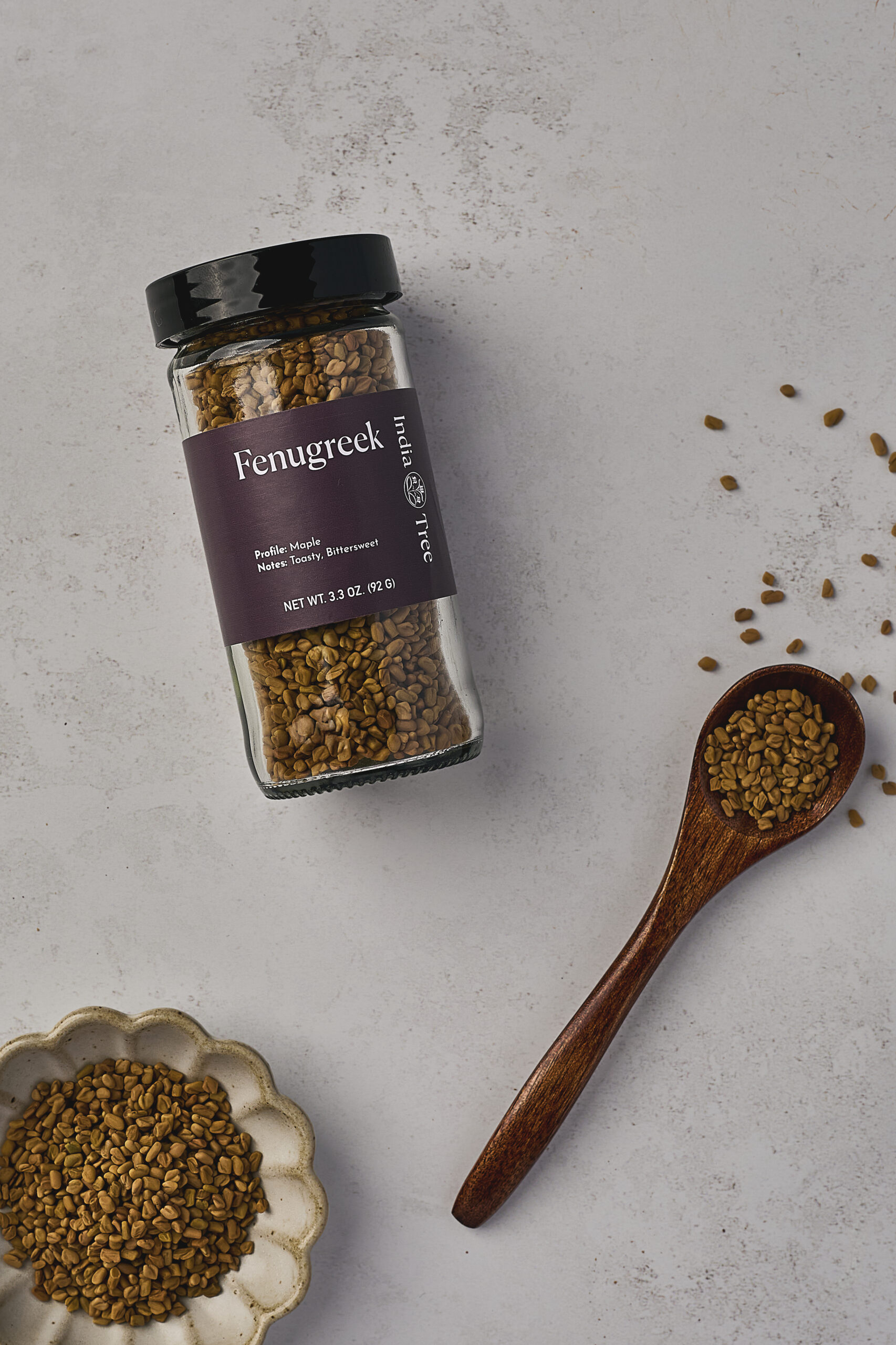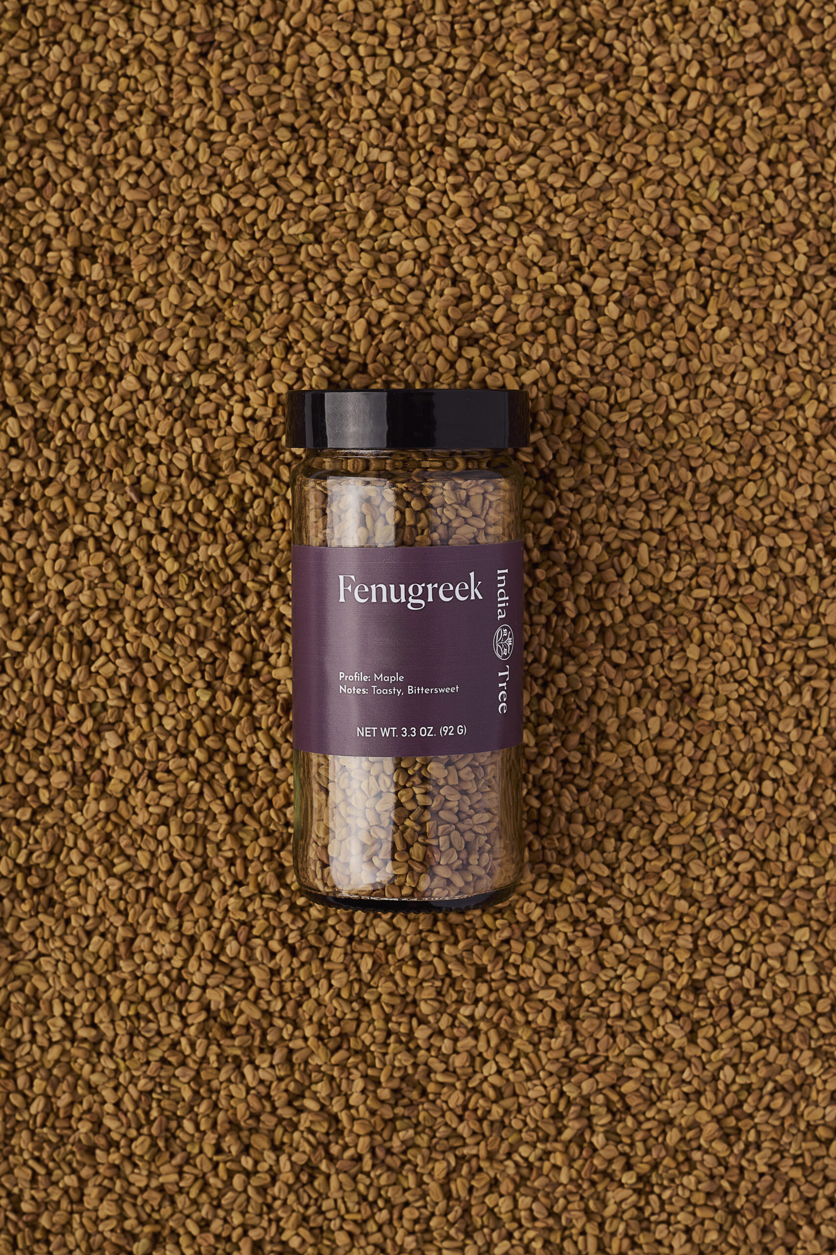 Fenugreek seeds (methi) with maple-bitter warmth for blooming into curries, dals, pickles, and slow broths – part of the Savory Seasonings and Seeds collections from India Tree.