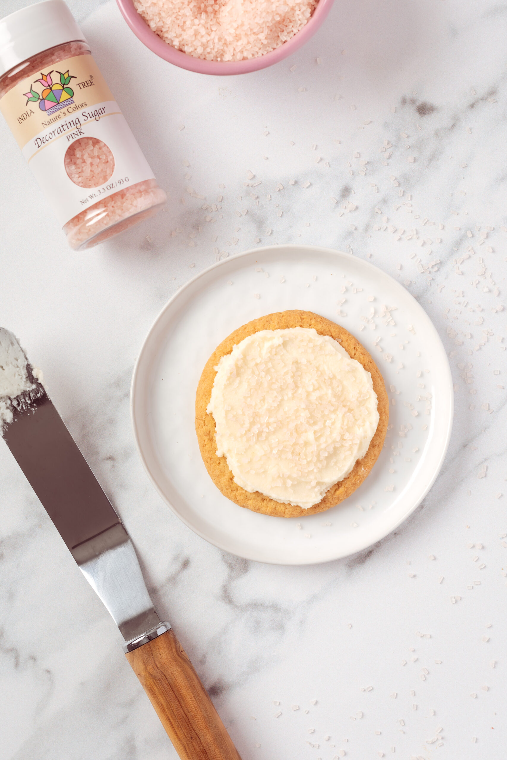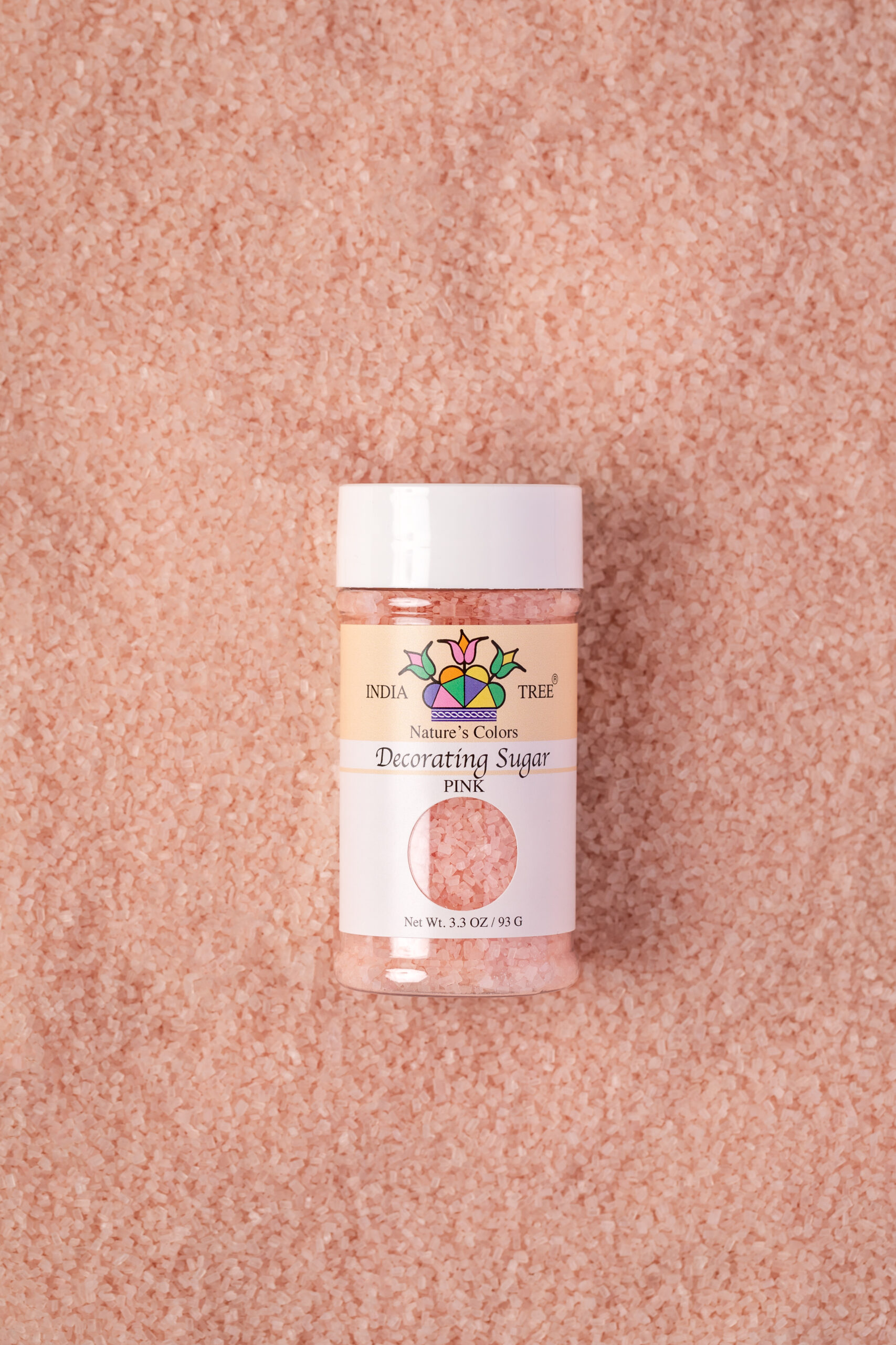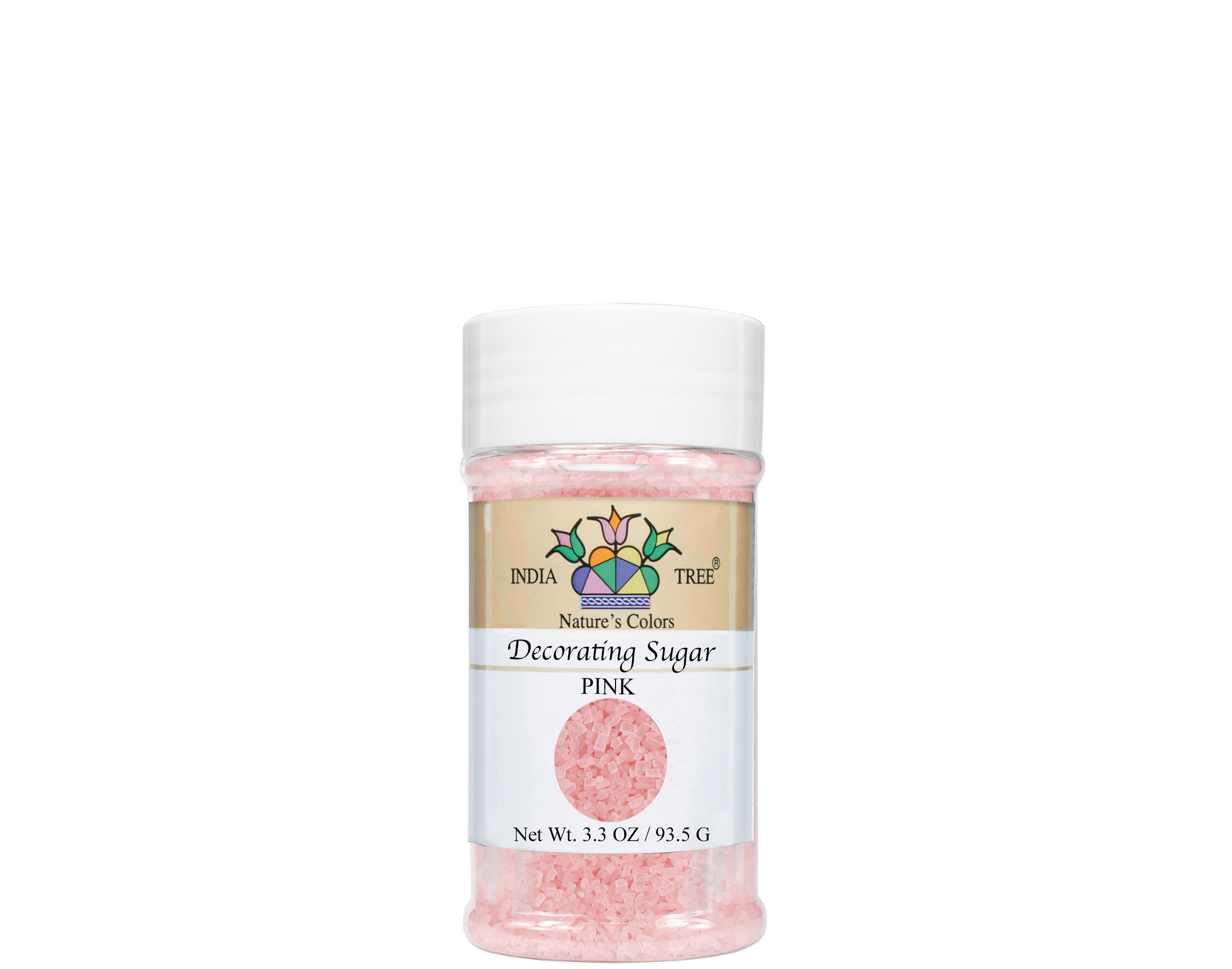 India Tree Natural Pink Decorating Sugar is a coarse crystal decorating sugar with a larger grain for sparkle and texture. Colored with beetroot color and turmeric, it adds natural pink color to cookies, cupcakes, and iced pastries without synthetic dyes.