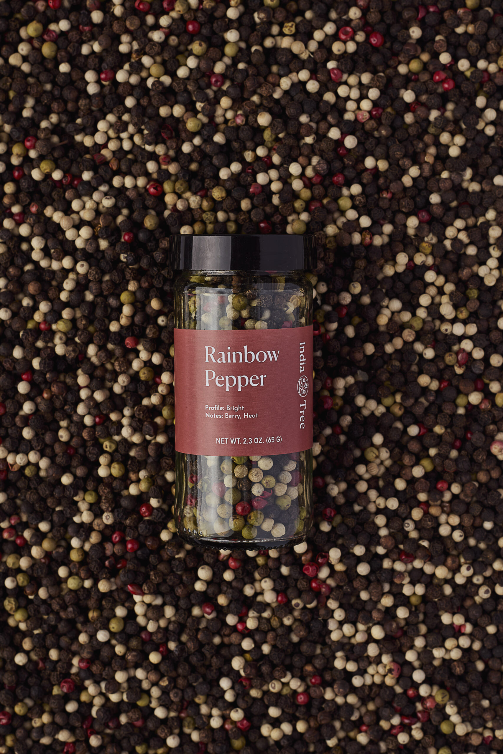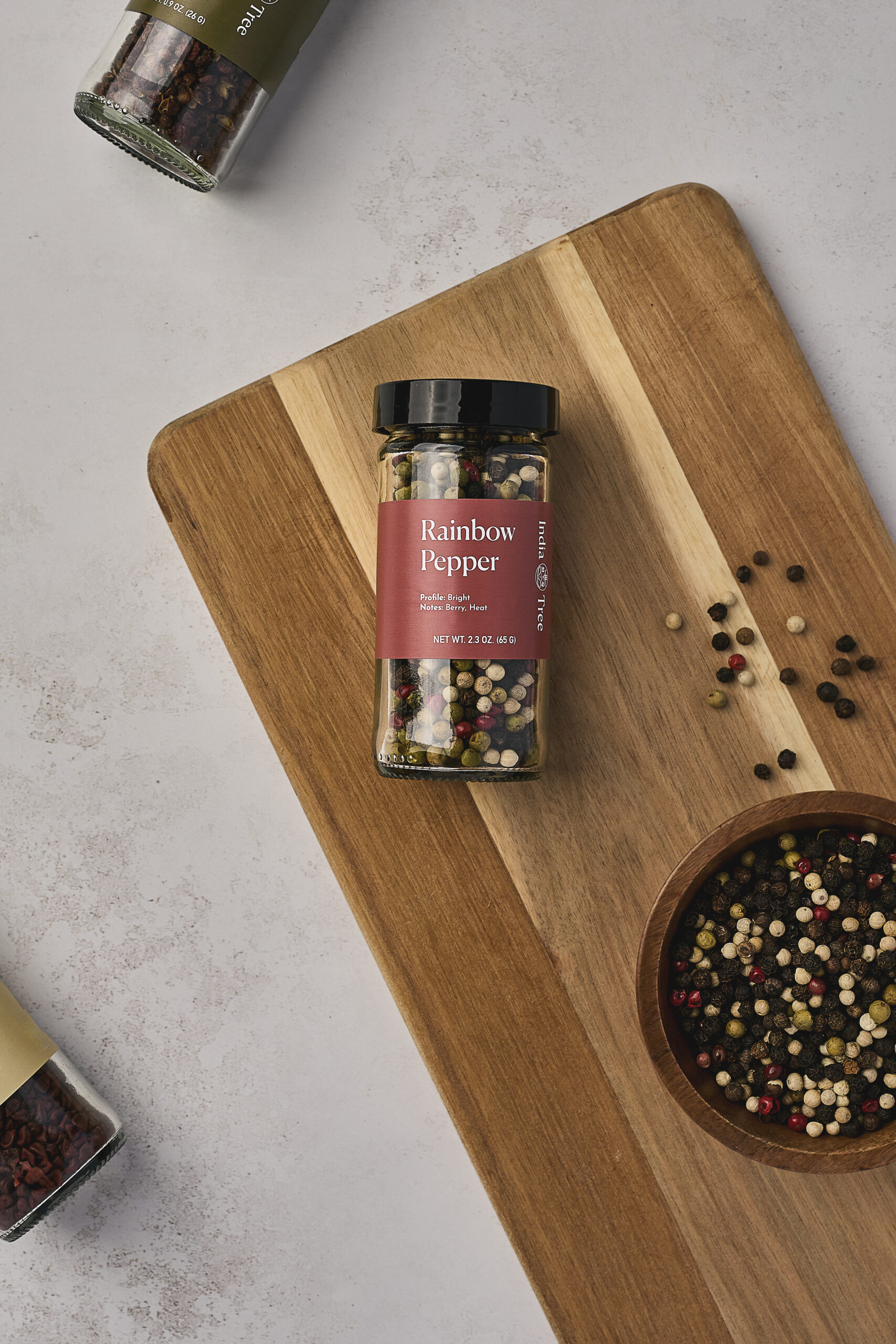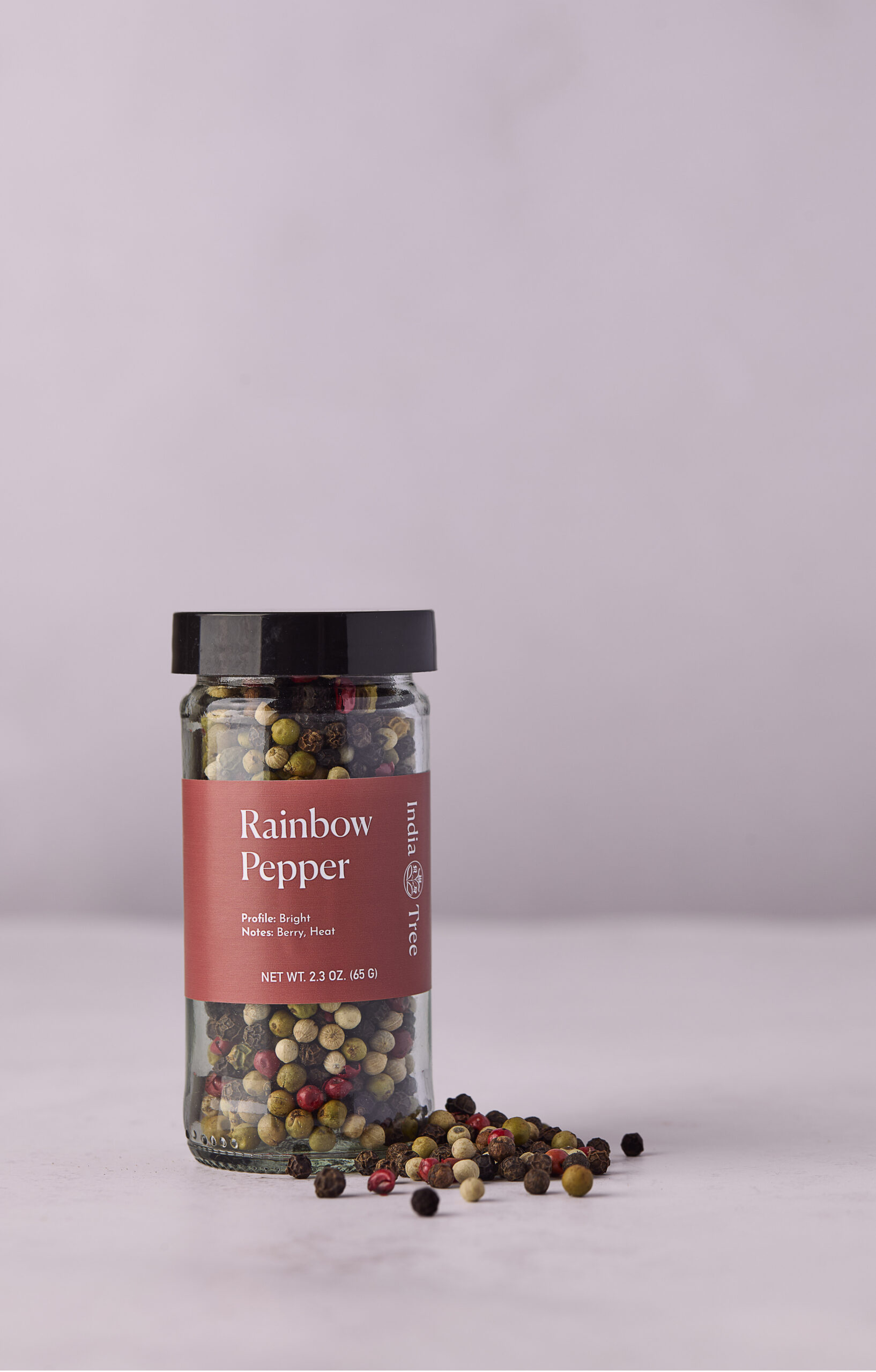 India Tree Rainbow Peppercorns combine black, white, green, and pink peppercorns for a layered profile that reads bright and lifted, then settles into clean, balanced heat. Crack fresh for visible color and aromatic lift, or grind fine when you want a nuanced pepper finish in vinaigrettes, pan sauces, and broths.