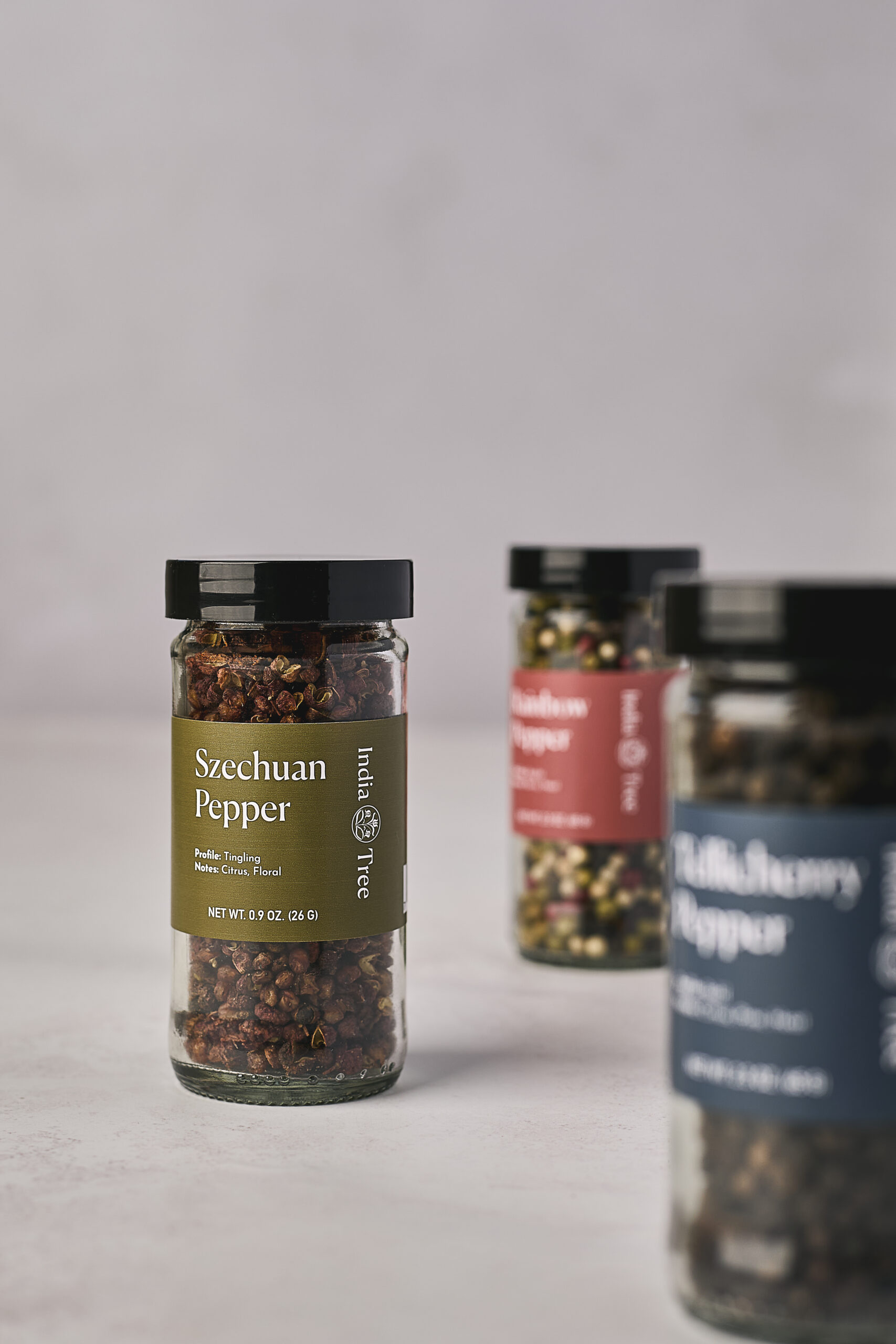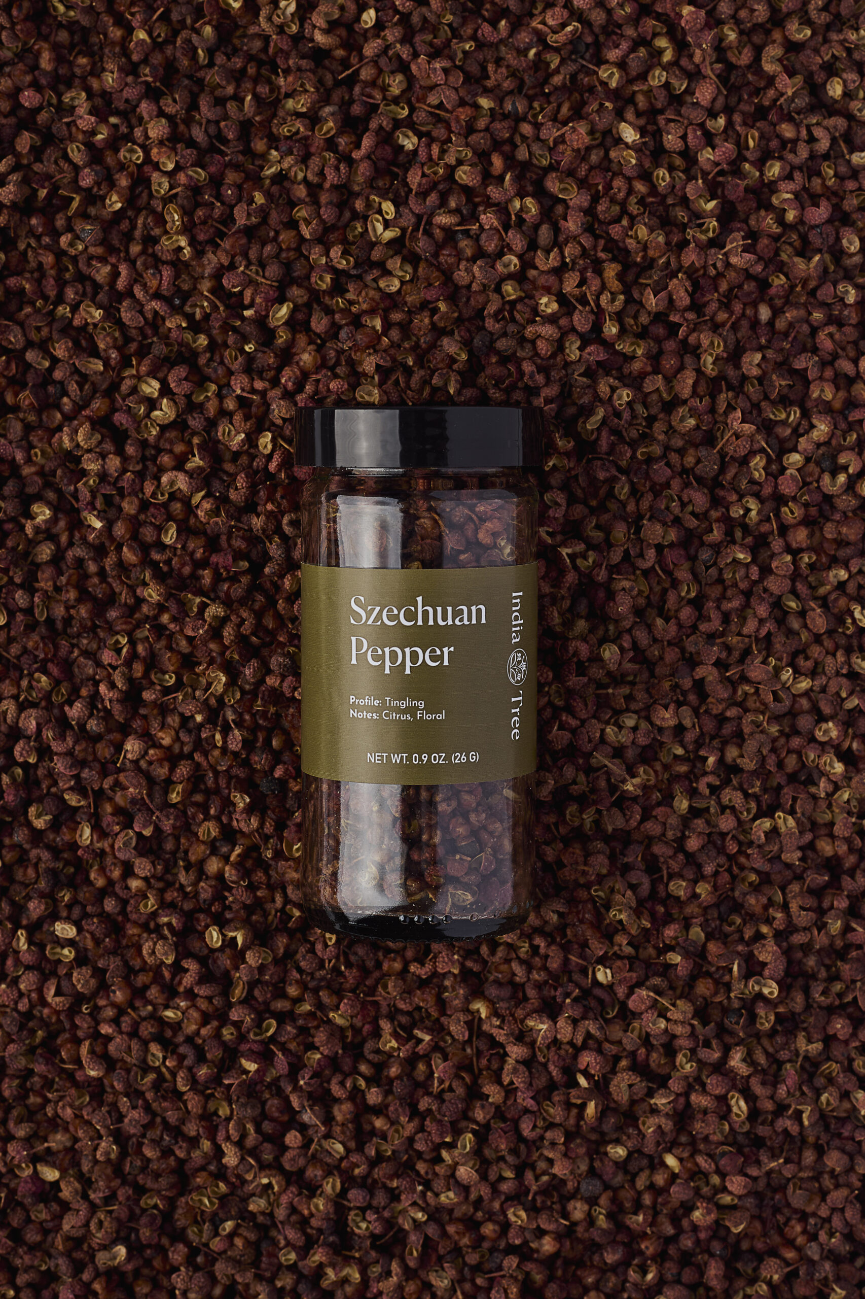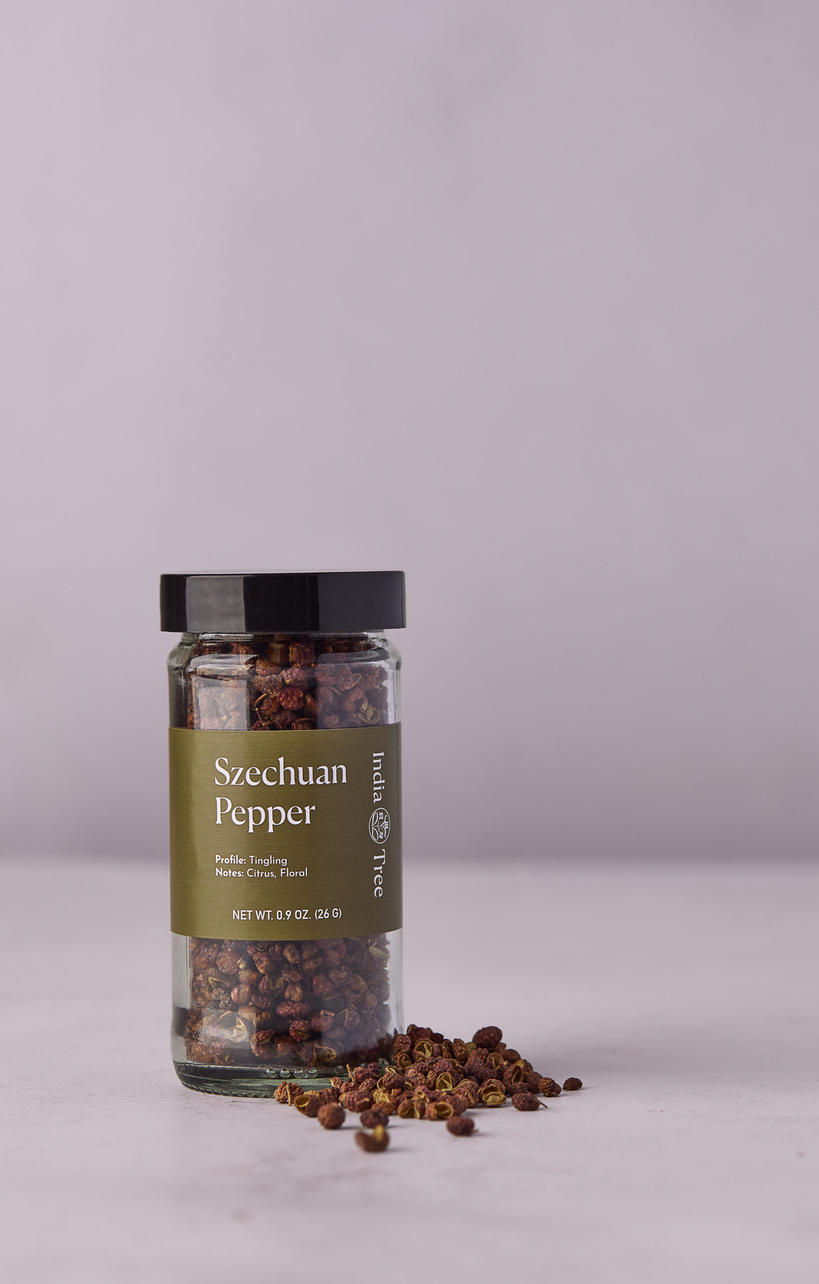 Szechuan peppercorns with warm citrus, layered spice, and a clean tingling finish for oils, noodles, broths, and modern pantry cooking — India Tree spices.
