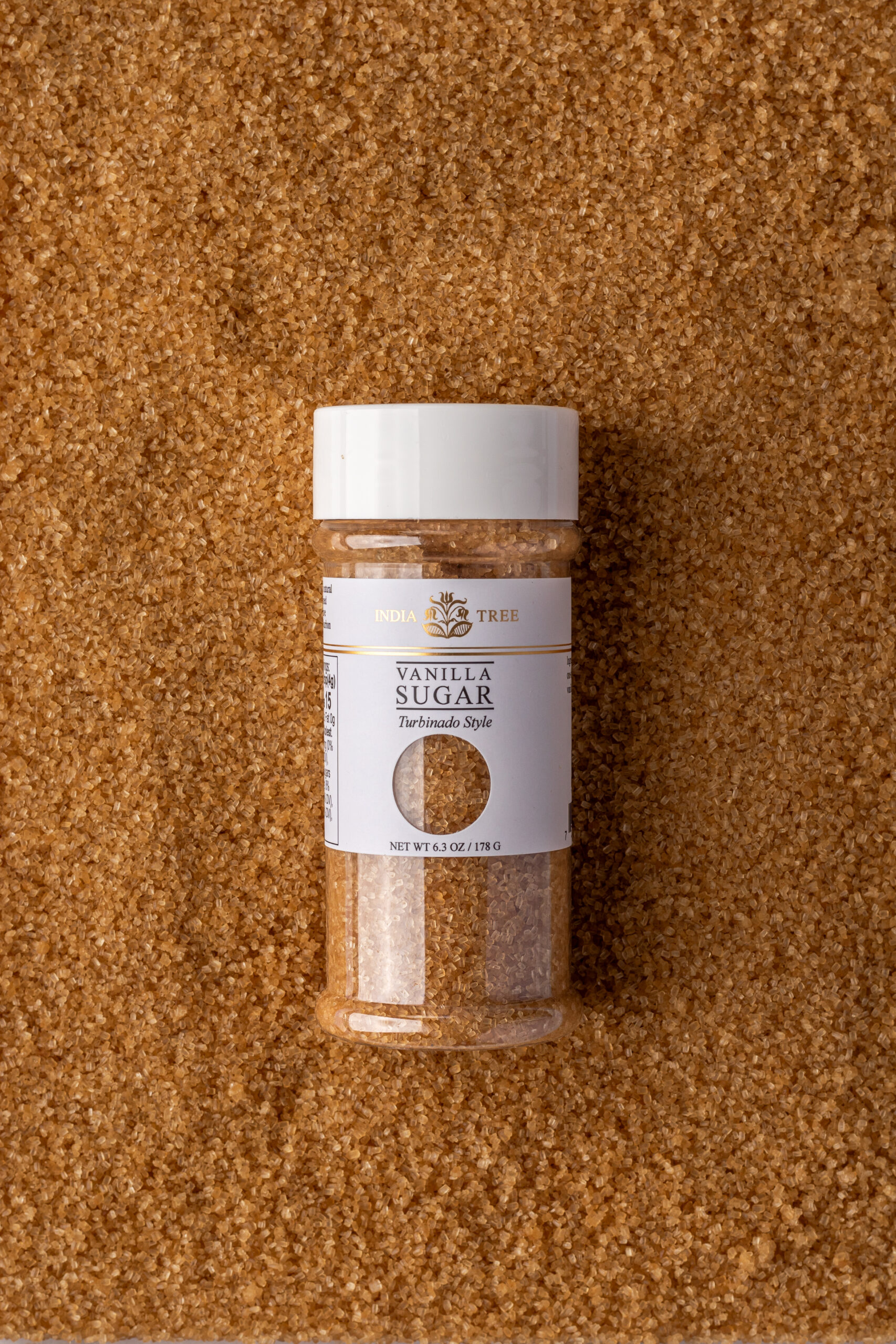 Vanilla sugar made with demerara cane sugar and a whole bourbon vanilla bean for baking, coffee, tea, and dessert finishing - part of the Specialty Sugars and Finishing Sugars collections from India Tree.