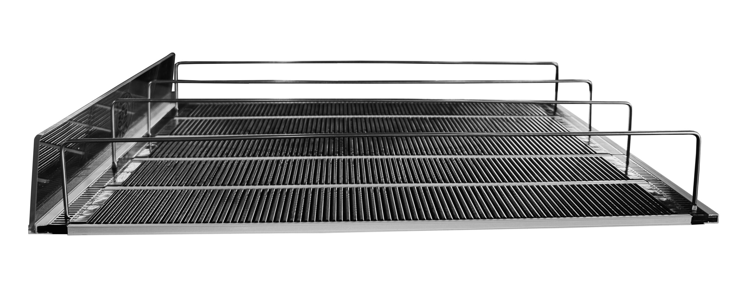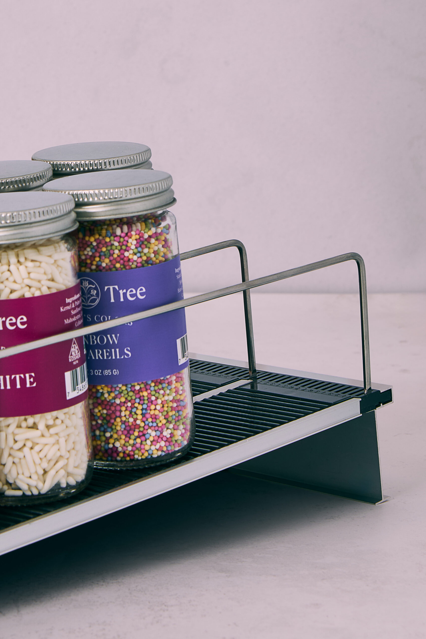 To optimize product visibility, shelves can be angled using three different riser options. The 1-inch riser is ideal for most products, including lightweight spice jars, but ½-inch and 1 ½-inch risers are also available.