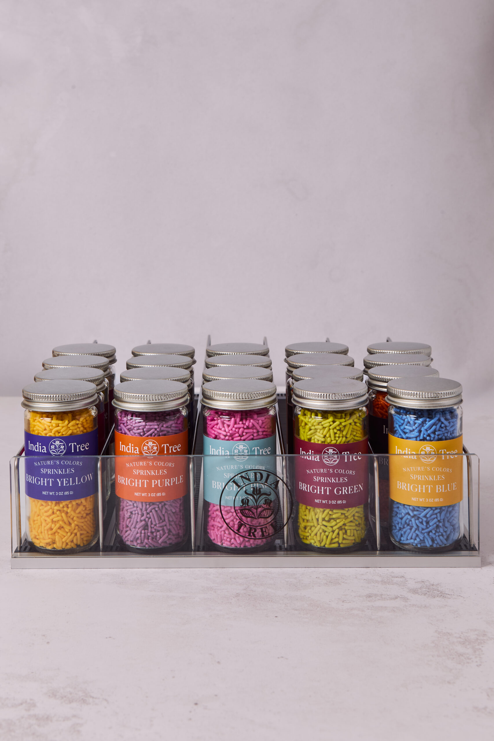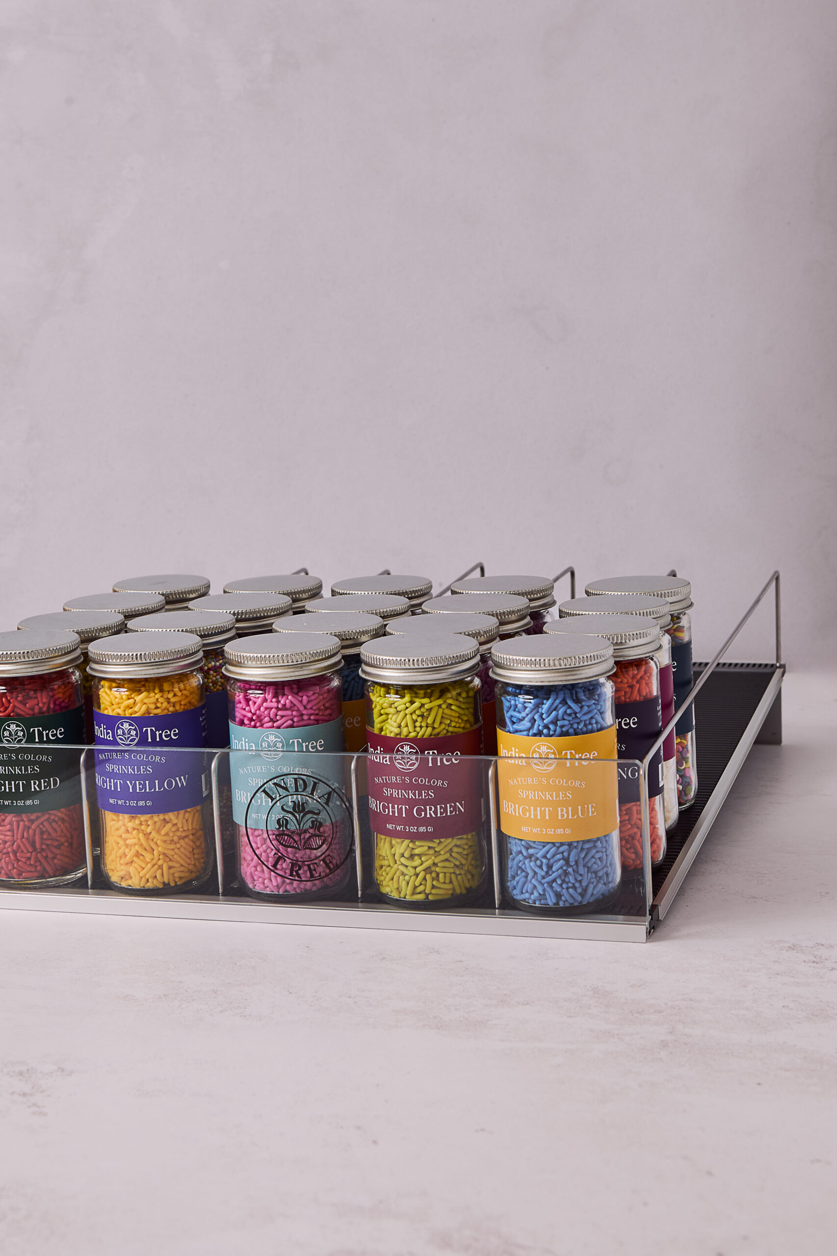 Our roller shelves offer maximum flexibility. Each 12″ wide, 19.5″ deep section is modular, allowing for easy customization in-store. The shelves themselves are highly configurable, with adjustable wire dividers to accommodate any product size. Designed around our small jars, each shelf can display six facing products, but can easily be adapted to hold larger jars or even chef packs.